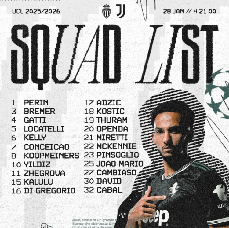 1月27日讯 本周四,尤文图斯在官方社媒公布了客场对阵摩纳哥的欧冠比赛名单,伊尔迪兹领衔,戴维、布雷默、孔塞桑等在列。
